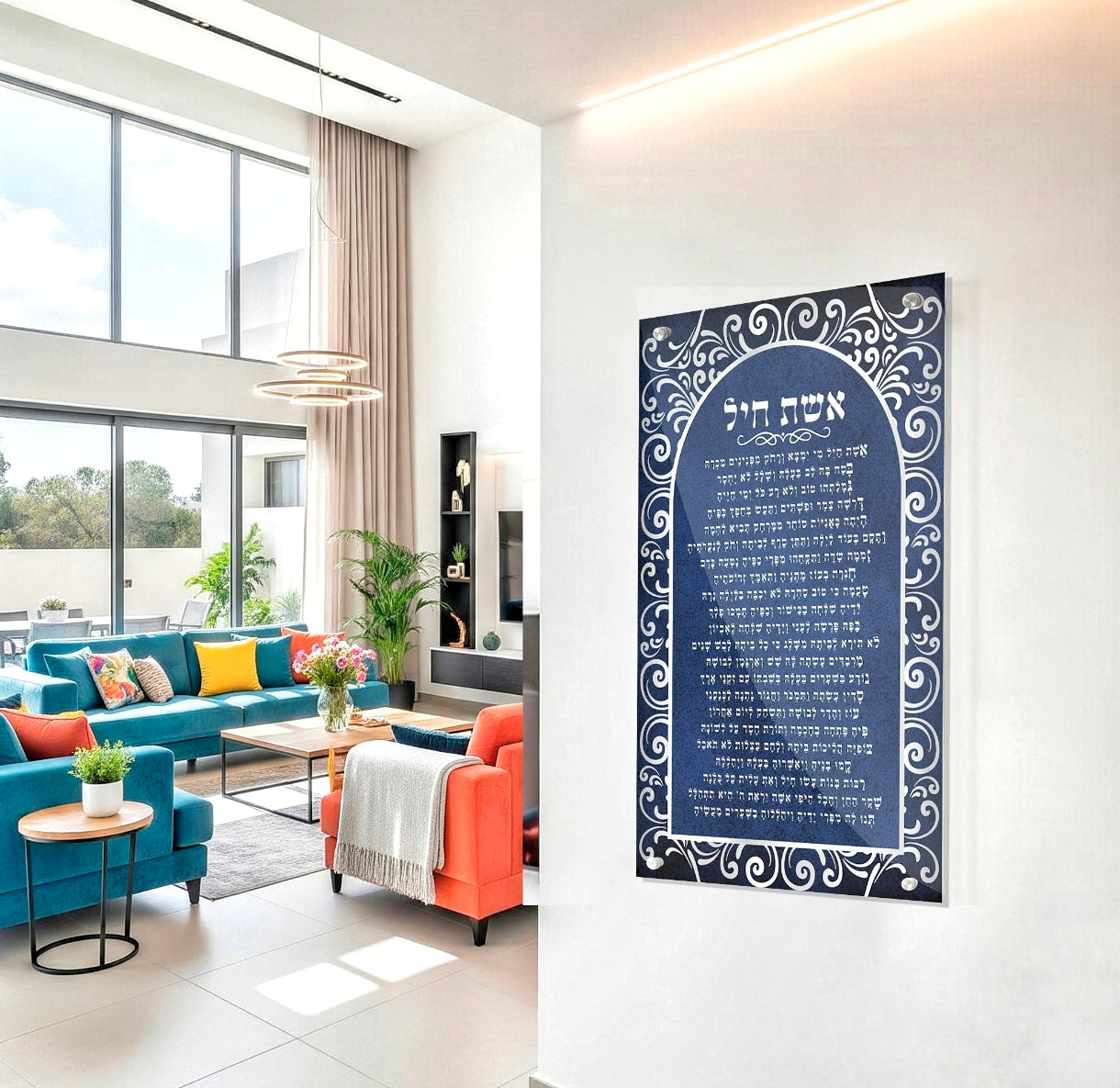 צירת האומנות "אשת חיל" היא פריט אמנותי מרהיב ביופיו, המגלם את עוצמתה, חוכמתה וכבודה של האישה. הטקסט המלא של "אשת חיל" משולב בעיצוב בטוב טעם, ומוסיף עומק ומשמעות דתית ותרבותית לכל פינה.