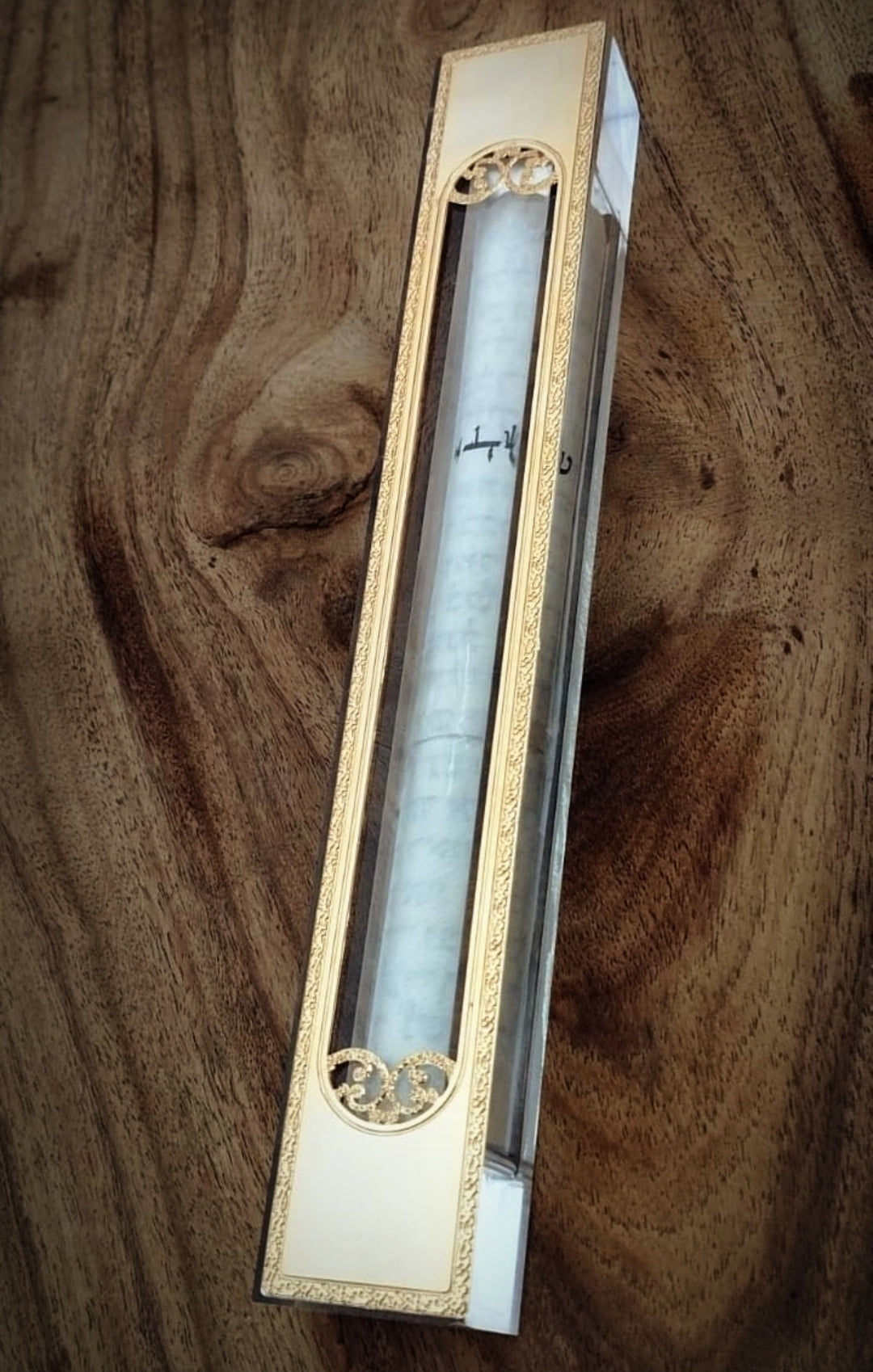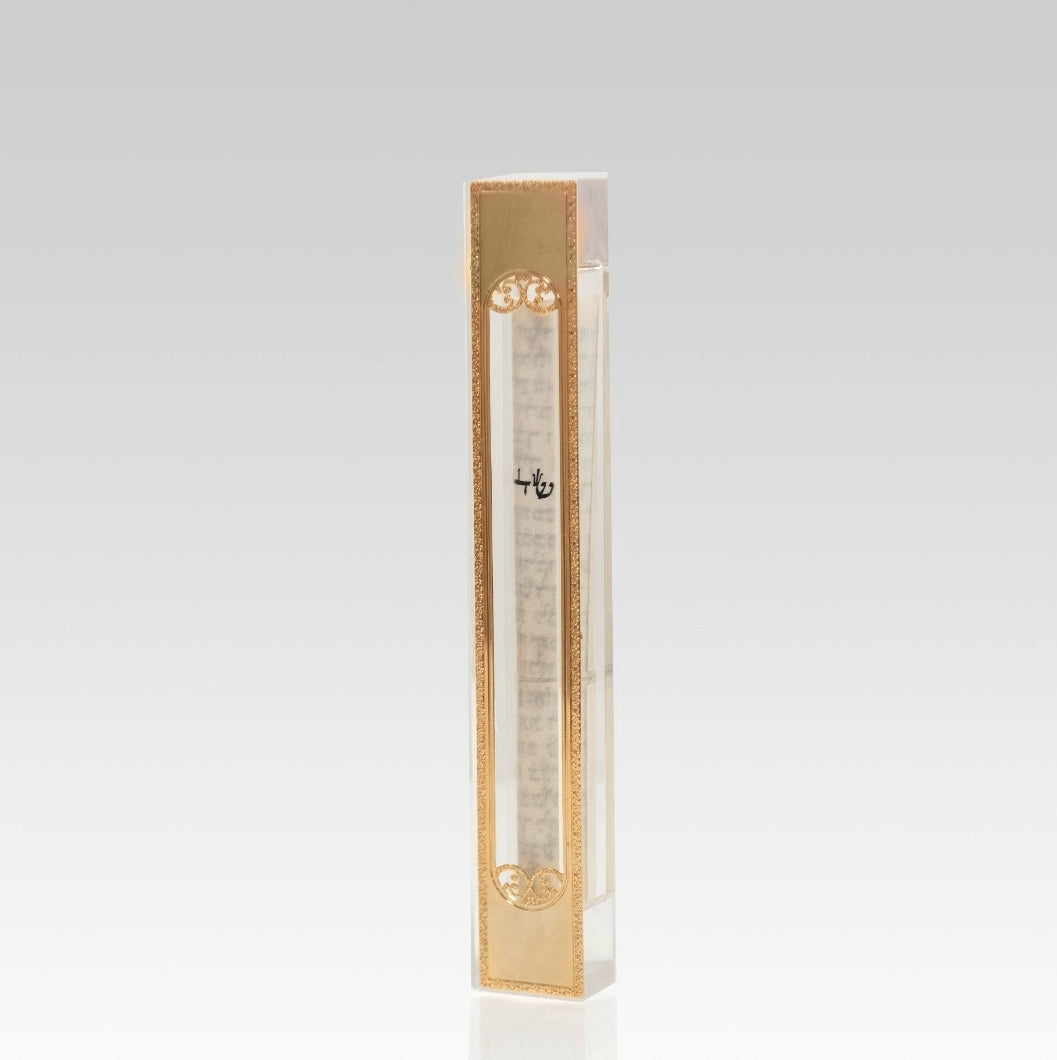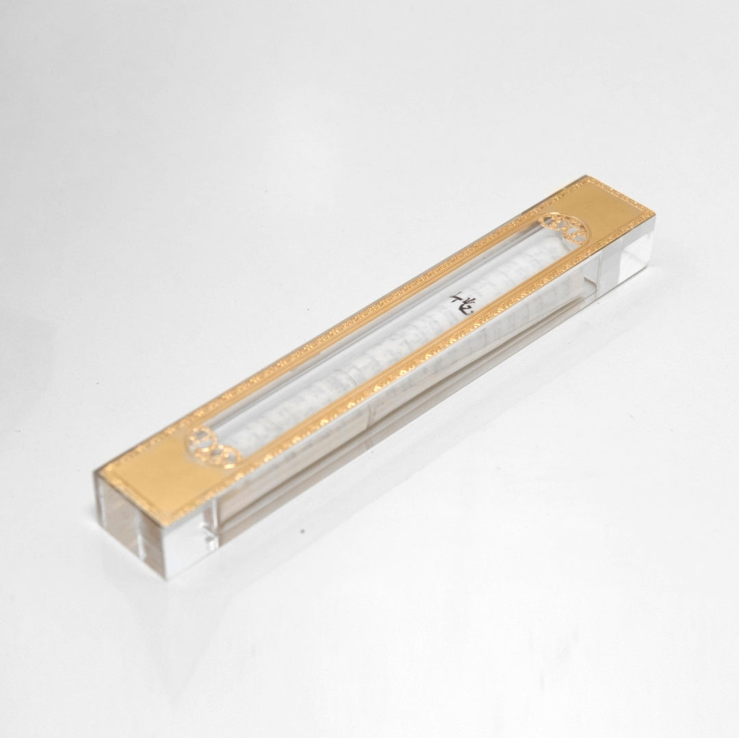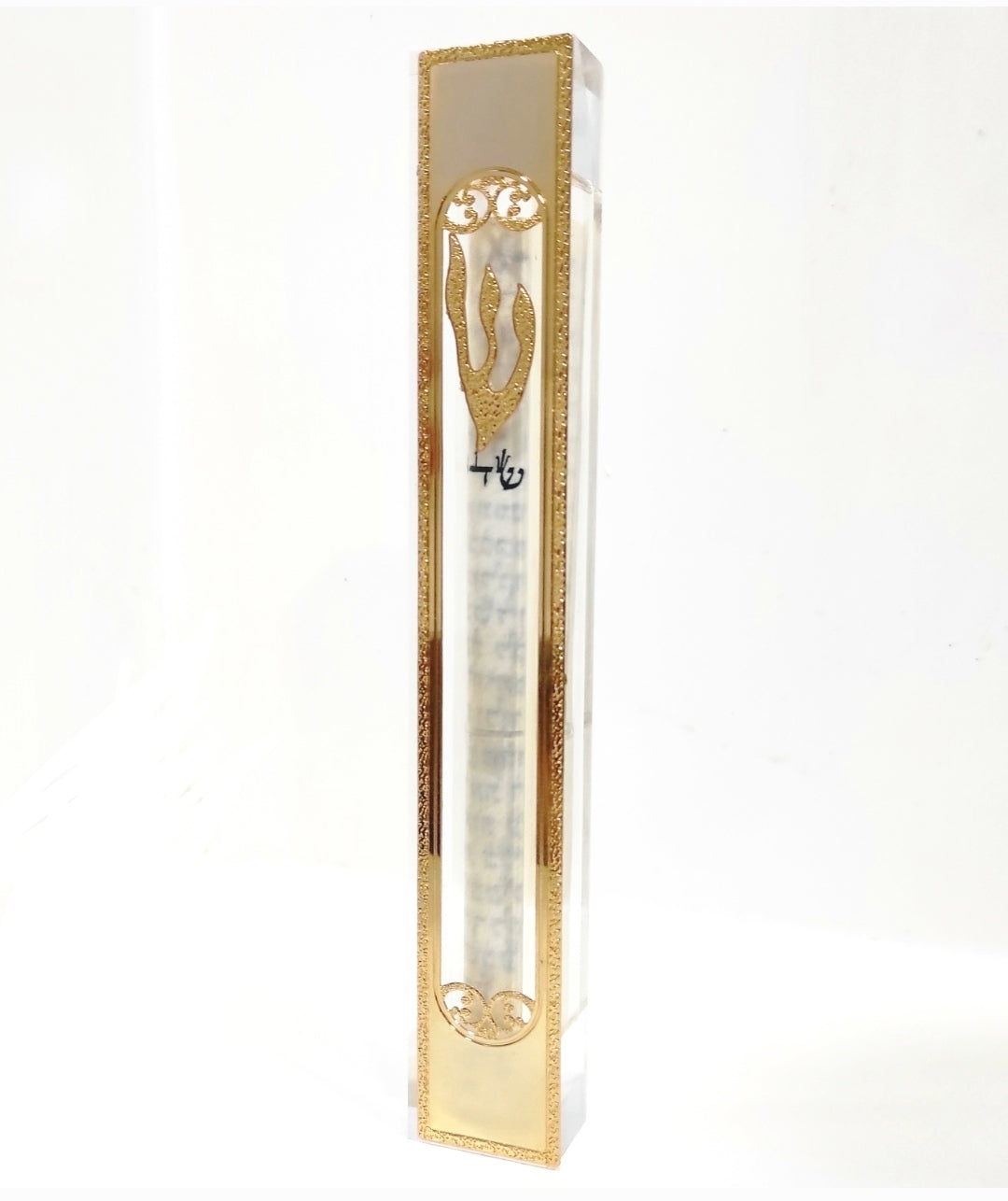 האמנות של אספקלריה באה לידי ביטוי בכל פרט. בית המזוזה עשוי מאקריליק קריסטלי איכותי במיוחד, המעניק לו מראה יוקרתי וברק, ומשלב גימור זהב מבריק. החיתוך והחריטה האמנותית על הגימור הזהב יוצרים דוגמאות מורכבות ומרקמים שונים, המוסיפים עומק ויזואלי וממחישים את ההקפדה על הפרטים.