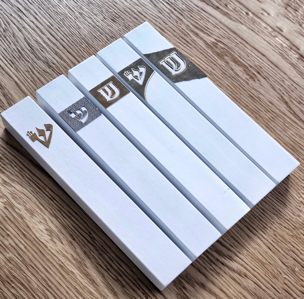 בית מזוזה יוקרתי מעץ מלא לבן מבית אספקלריה, מעוטר באות "ש" זהובה בחיתוך וחריטה אומנותית. כולל תעלה עם הברגה להגנה על הקלף.