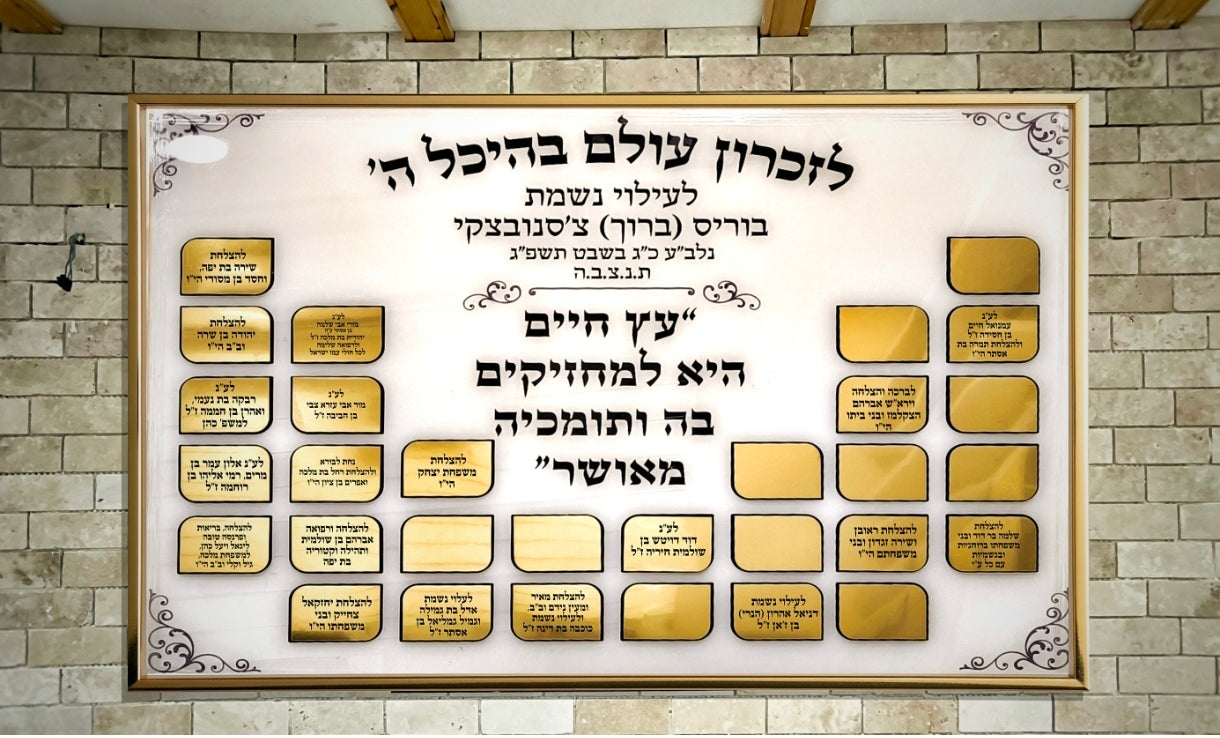 בין אם מדובר בהנצחת נפטר, הוקרה לתורמים לבית כנסת, ישיבה, או כל מוסד קודש אחר, או ציון אבני דרך משפחתיות, לוח זה מציע דרך מכובדת ומרגשת לשמר את הזיכרון וההערכה לדורות הבאים.