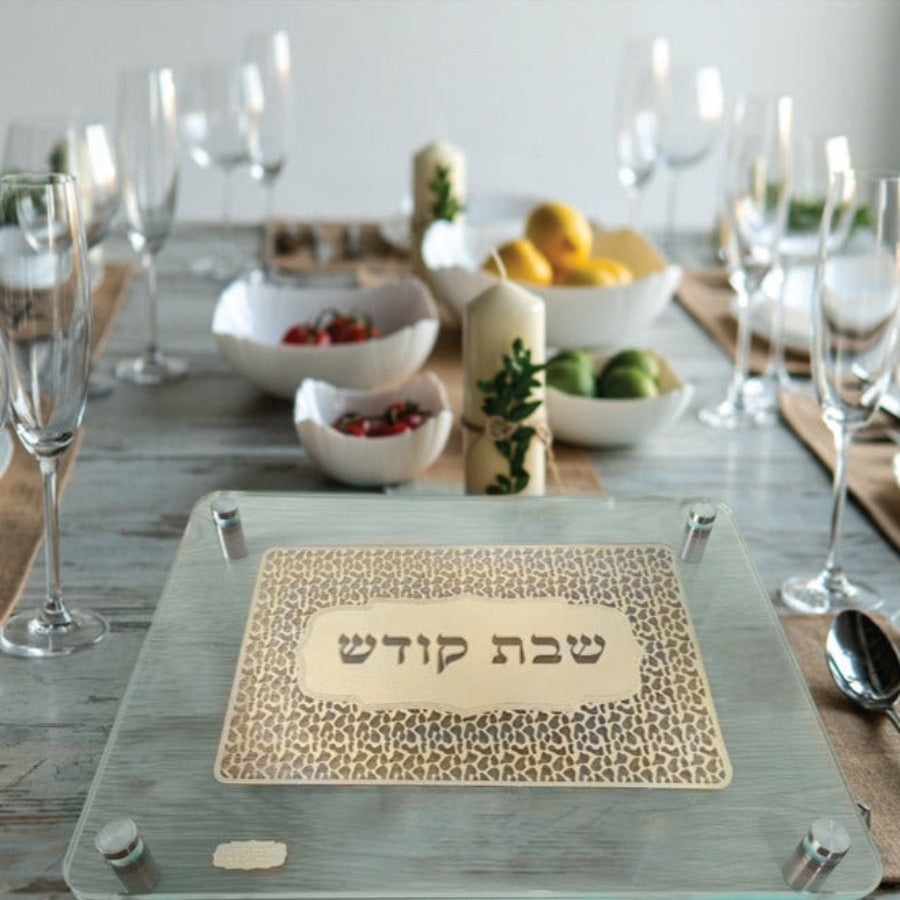 הציגו את חלות השבת באלגנטיות ובקדושה. מגש חלה מזכוכית מחוסמת בגודל 30x45 ס"מ, המשלב יופי מודרני עם סגנון ייחודי. המגש כולל שכבת חיתוך וחריטה אומנותית בלייזר בגימור כסוף מבריק, עם דוגמת מילוי מנוקדת המעניקה טקסטורה עשירה, סביב הכיתוב המרובע "שבת קודש". עיצוב זהוב-כסוף שובה עין, המגש ירשים את האורחים וישדרג כל שולחן שבת. עמיד, יציב וקל לניקוי.