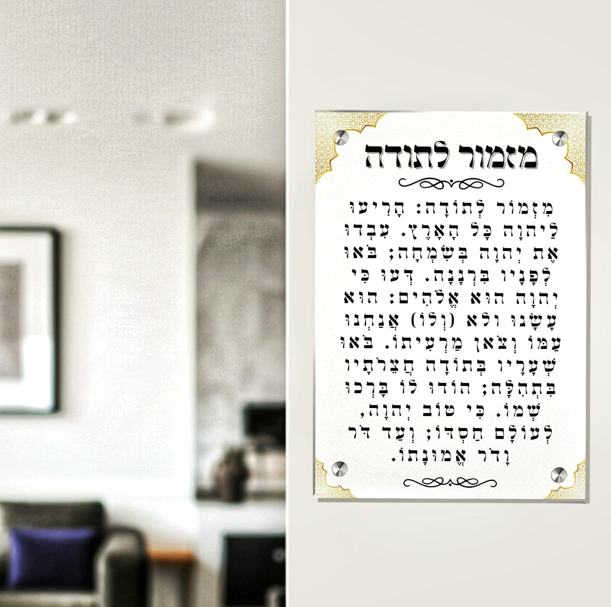 הטקסט המלא של "מזמור לתודה" כתוב באותיות ברורות וקריאות על רקע בהיר, ומוקף במסגרת מעוצבת עדינה שמוסיפה נופך של יופי ויוקרה. לוח הזכוכית יוצר אפקט מבריק ועמוק, ונתלה באמצעות ארבעה מחזיקי מתכת מודרניים בפינות, המעניקים לו מראה צף ואלגנטי על הקיר.