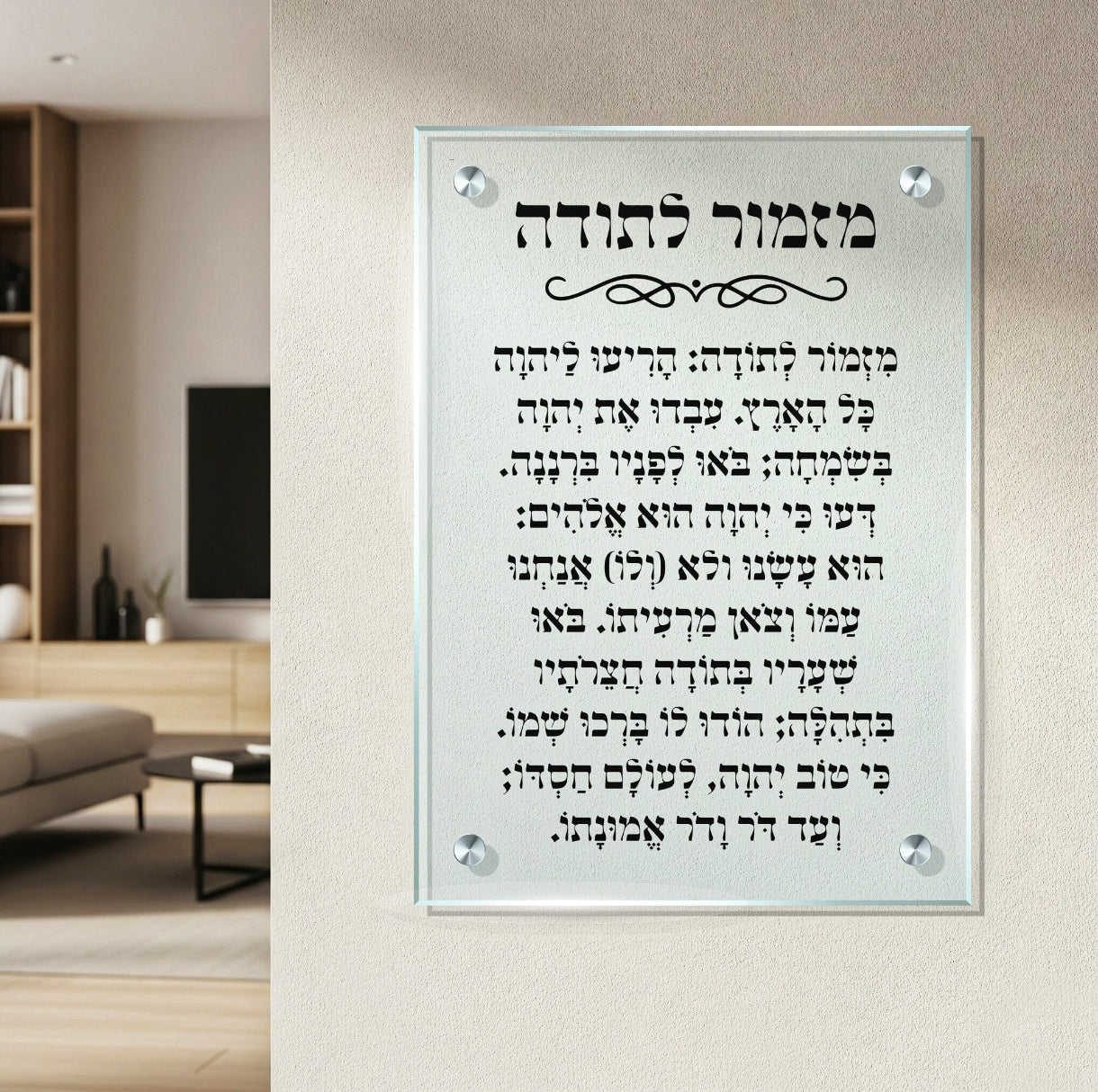 הכניסו לביתכם או למשרדכם אווירה של הודיה וברכה עם מזמור לתודה, המודפס באלגנטיות על לוח זכוכית איכותי. מזמור תהילים זה (פרק ק') הוא תפילה עוצמתית המבטאת הכרת תודה לקב"ה, ונוכחותו בולטת ומרגשת. הטקסט המלא של "מזמור לתודה" כתוב באותיות שחורות, ברורות וקריאות, עם כותרת מודגשת בחלק העליון. הטקסט מוקף במסגרת מעוצבת עדינה שמוסיפה נופך של יופי קלאסי ומודרני. הלוח נתלה באמצעות ארבעה מחזיקי מתכת מבריקים בפינות, המעניקים לו מראה צף על הקיר, ויוצרים עומק ויוקרה.