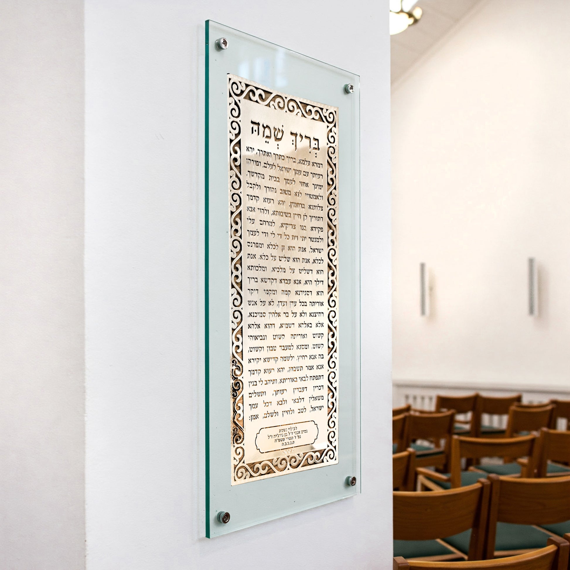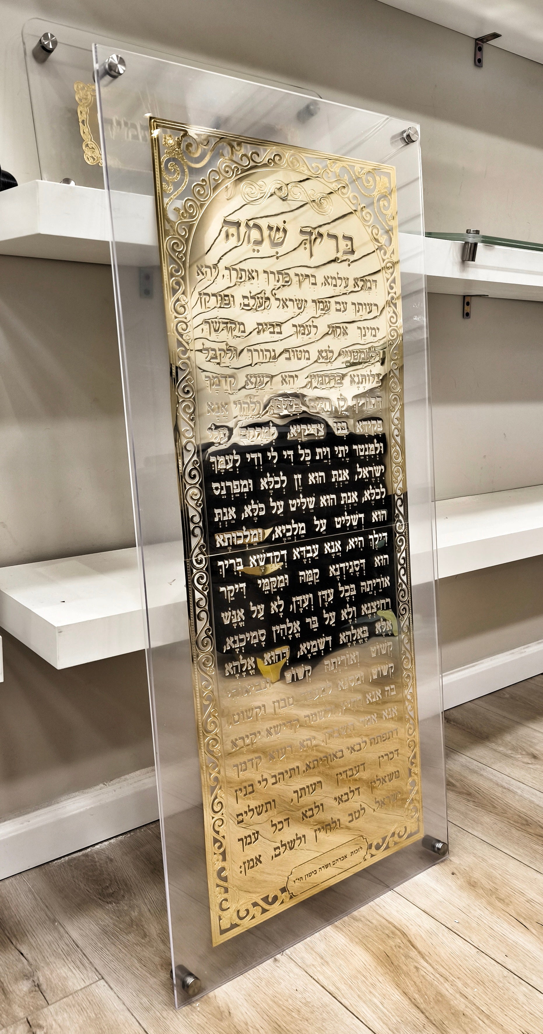 השלט מעוצב על גבי פלטת זהב איכותית ונוצץ במראה עשיר ויוקרתי. האותיות המעוצבות בקפידה יוצרות ניגוד אלגנטי, והטקסט הקדוש של 'בריך שמיה' מקבל נוכחות מרשימה. הפלטה עצמה ממוקמת באופן ייחודי בין שתי זכוכיות מחוסמות, שמגנות עליה ומוסיפות ממד של עומק וזוהר. הסידור הזה לא רק שומר על השלט לאורך זמן, אלא גם יוצר אפקט תלת-ממדי שמושך את העין ומעניק לו מראה מודרני ומתוחכם.