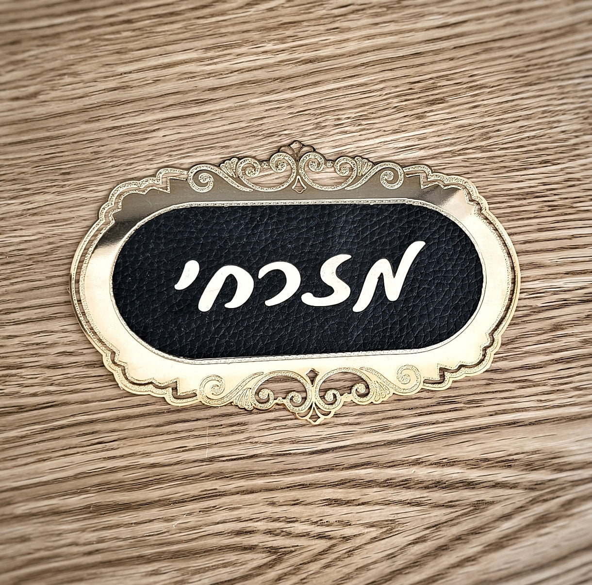 זהו שלט בית אלגנטי בציפוי זהב, המיועד לדלת. השלט כולל מסגרת זהב מורכבת עם דוגמאות חיתוך לייזר מפורטות המקיפות פנל אובאלי מרכזי. לפנל המרכזי יש טקסטורה מנצנצת ומבריקה בגוון זהב-וורוד או נחושת-זהב. המילה העברית "כהן" מוצגת באופן בולט באותיות שחורות החתוכות מבד או מעור מעובד, ויוצרות ניגוד יפה על רקע הנצנצים. העיצוב הכללי מרמז על פריט יוקרתי ומותאם אישית לבית.