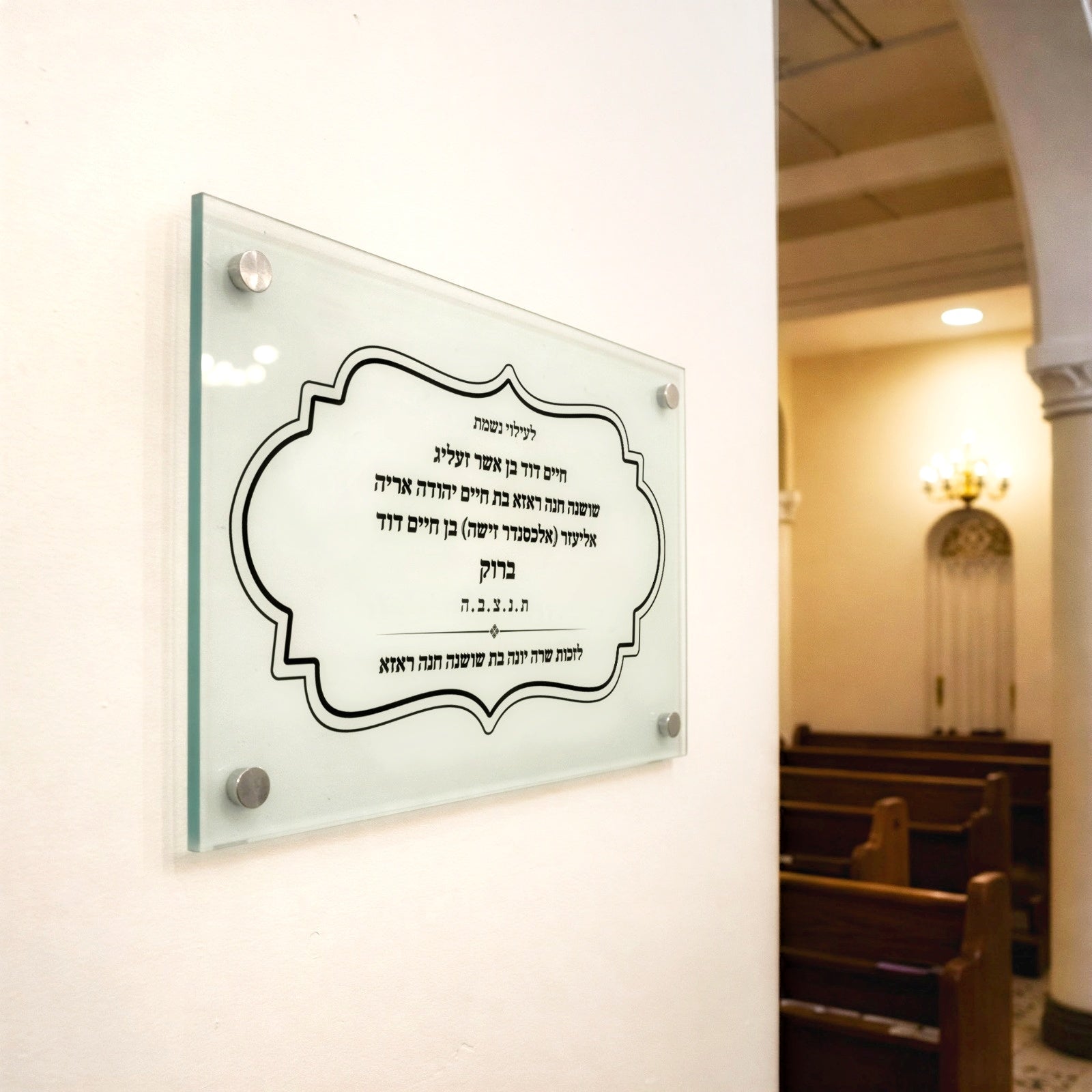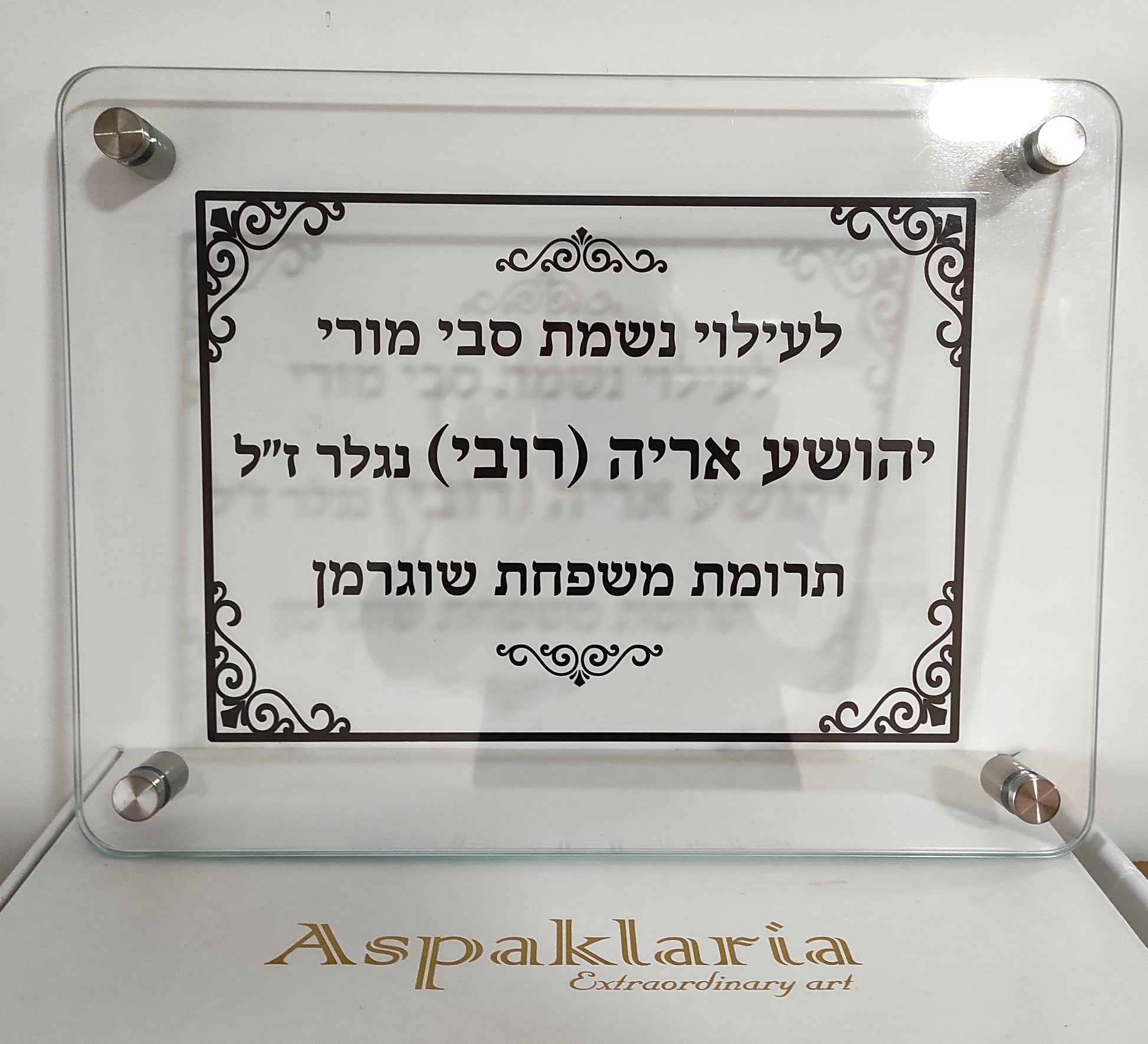 שלט לעילוי נשמת עם זכוכית מחוסמת
