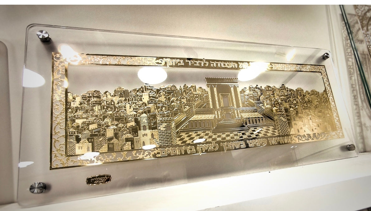 תמונת בית המקדש בזהב ממוסגרת בטכניקה מודרנית ונקייה של זכוכית מחוסמת כפולה עם ספייסרים. שתי שכבות הזכוכית המחוסמת, הידועה בחוזקה ועמידותה, מגנות על היצירה מכל צד. בין שכבות הזכוכית ממוקמים ספייסרים (מרווחונים) עדינים, היוצרים חלל אוויר ומעניקים ליצירת הפליז המוזהבת מראה "מרחף" ואלגנטי. מסגור זה ללא מסגרת חיצונית מסורתית מאפשר ליצירה עצמה להיות במרכז הבמה ומשתלב באופן מושלם בעיצובים מודרניים ומינימליסטיים.