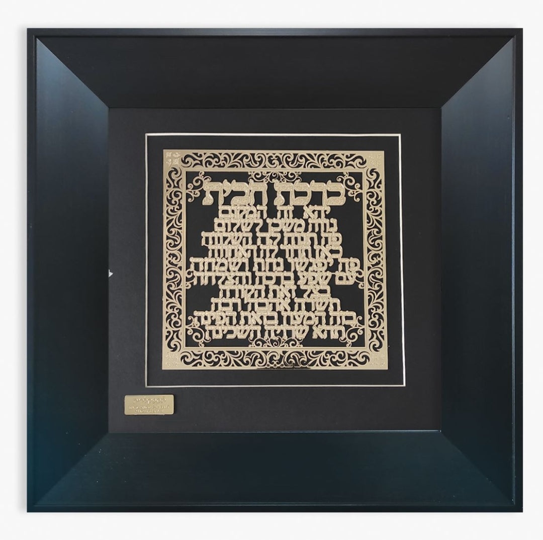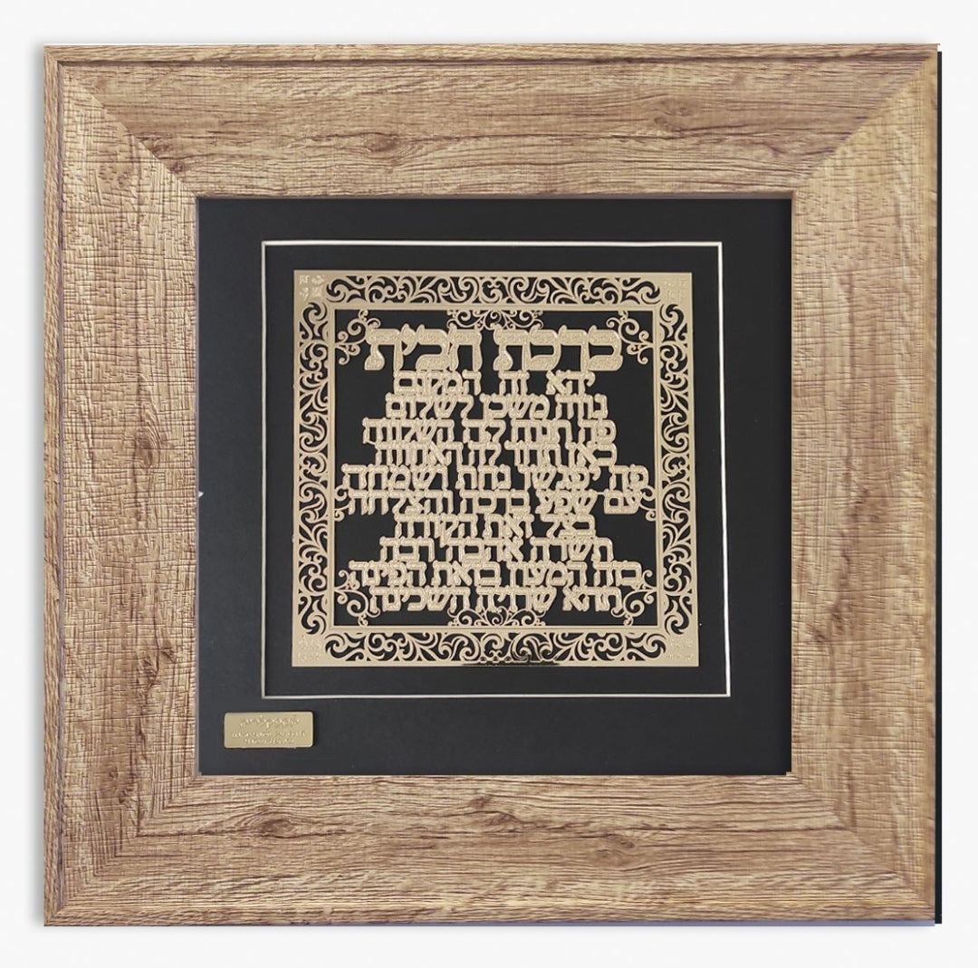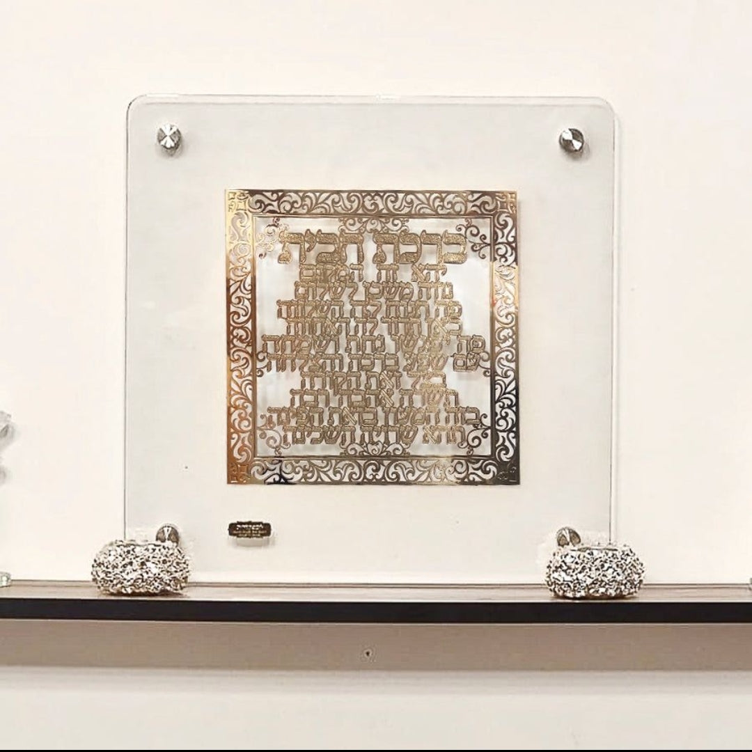 - ברכה בלב ליבו של העיצוב: ברכת הבית המוכרת והאהובה מופיעה כאן בפורמט מרובע ייחודי, מעוצבת באותיות עבריות מרהיבות בגימור יוקרתי דמוי זהב/ברונזה (נא לאשר את החומר המדויק), חתוכות בלייזר בדיוק מושלם, ומונחות בעדינות על רקע אקרילי צלול ואיכותי.