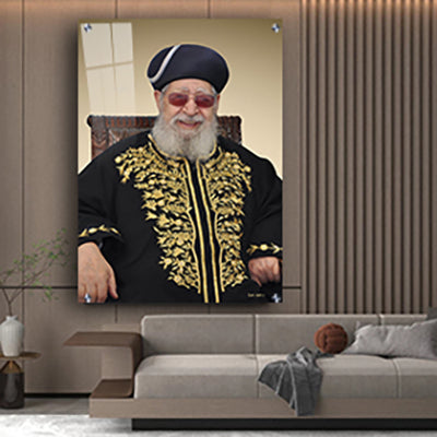 1565 - תמונה של הרב עובדיה יוסף יושב על כסא ומחייך להדפסה על קנבס או זכוכית