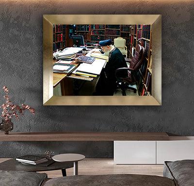 1579 - תמונה של הרב עובדיה יוסף יושב בחדר עם ספרי תורה ומתפלל להדפסה על קנבס או זכוכית