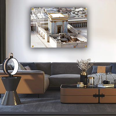 הביאו את קדושת בית המקדש לביתכם עם תמונה מרשימה זו, זמינה בהדפסה על זכוכית מחוסמת איכותית או על קנבס מתוח.