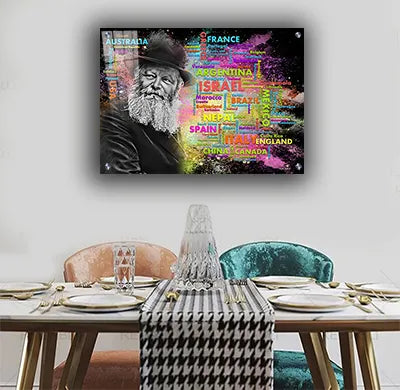 538 – ציור של הרבי מליובאוויטש על רקע שמות מדינות העולם על קנבס או זכוכית