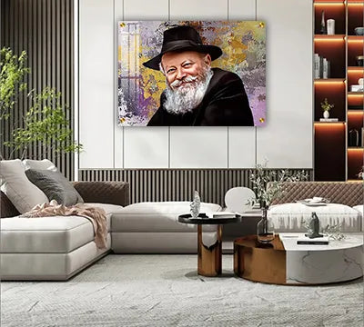 696 - ציור מודרני וצבעוני של הרבי מליובאוויטש מחייך על קנבס או זכוכית